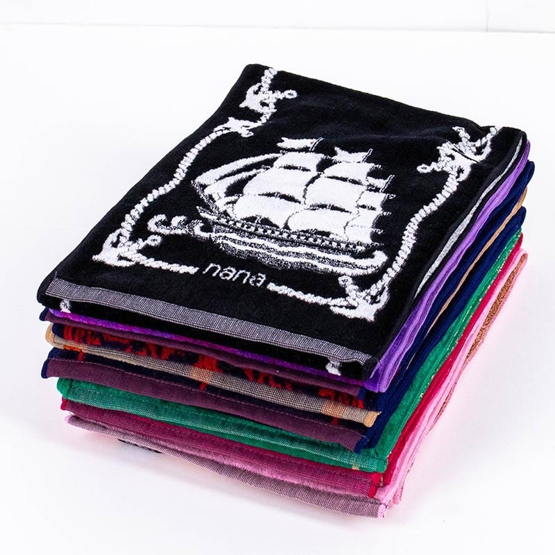 ナナ製品は意匠登録された独自のデザインと発色の豊かさ、肌触りの良さを追求する為、日清紡テキスタイルにてナナ製品向けに特別配合されたコーマ糸を使い、織りつけから最終縫製に至るまで今治の自社工場にて一貫生産を行い、プレミアムグレードを保っております。