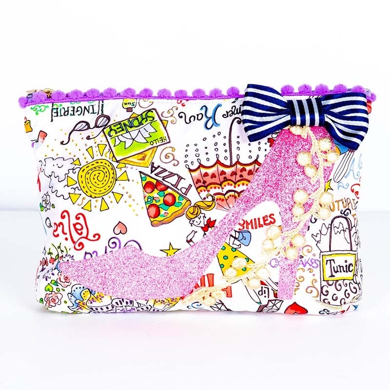 チュニックのタフタプリント スマイルプレゼントのヒールポーチ 白/ピンクです。